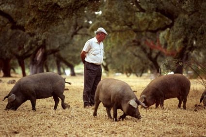 And I should add that the pig in question was of course a Pata Negro, the unique kind that produces the Jabugo ham my friend Jose sent me yesterday. These porcine aristocrats are so pampered that each one has a whole hectare to graze on. You can see a few at the top under the kindly eye of their owner.